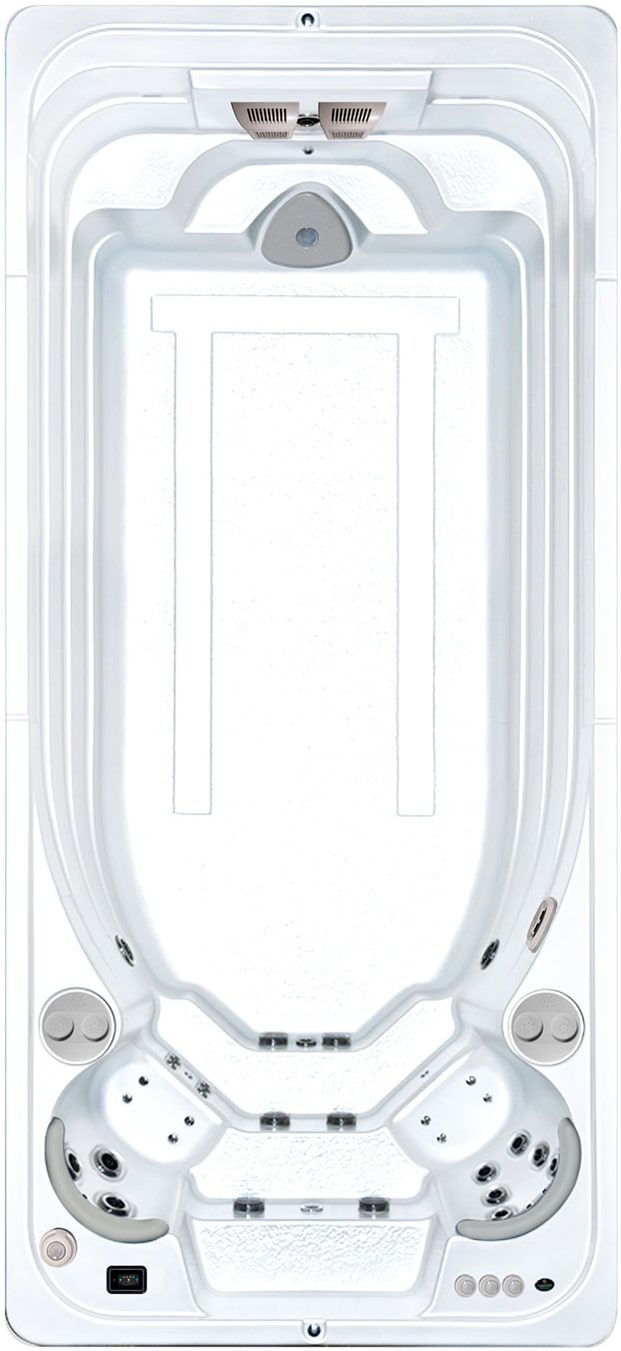 The AquaSport 17FX has two multi hydrotherapy massage seats making it a pool, hot tub and aquatic gym all-in-one. The swim spa is also a fiberglass reinforced acrylic one piece mini-pool that provides you more room to swim, jog, exercise or play than their 14FX foot cousin. Remember this swim spa and all of our other swim spa models because they require less space, cost less money and require less maintenance than a conventional pool.